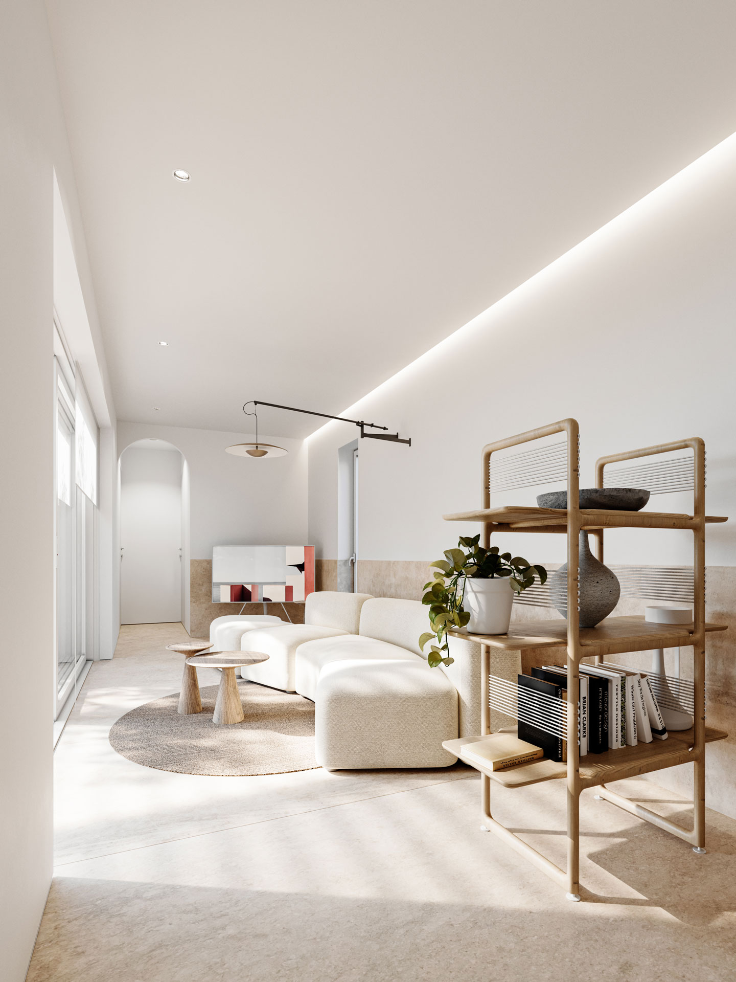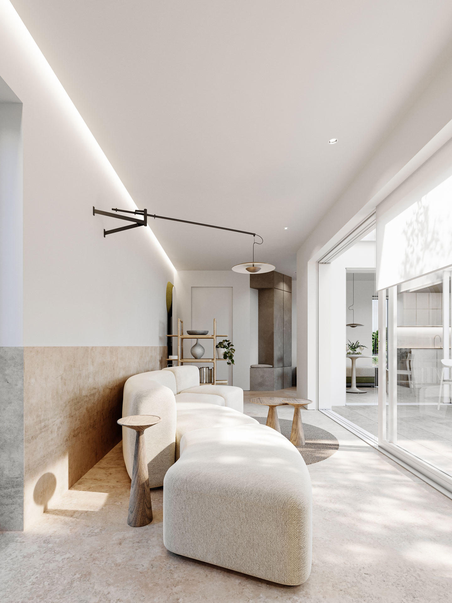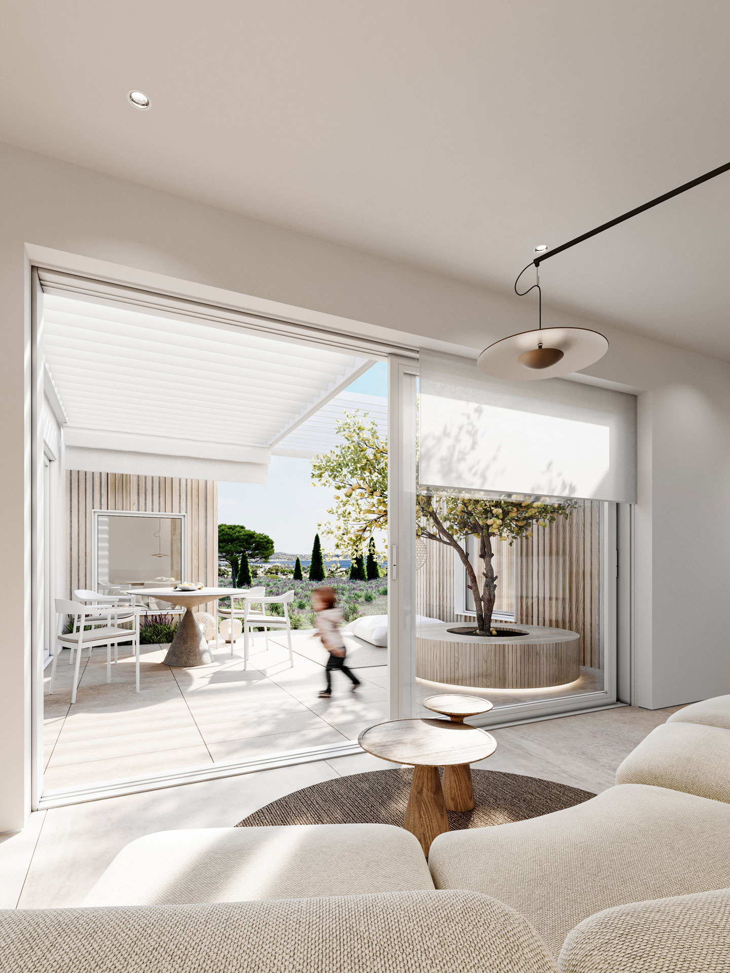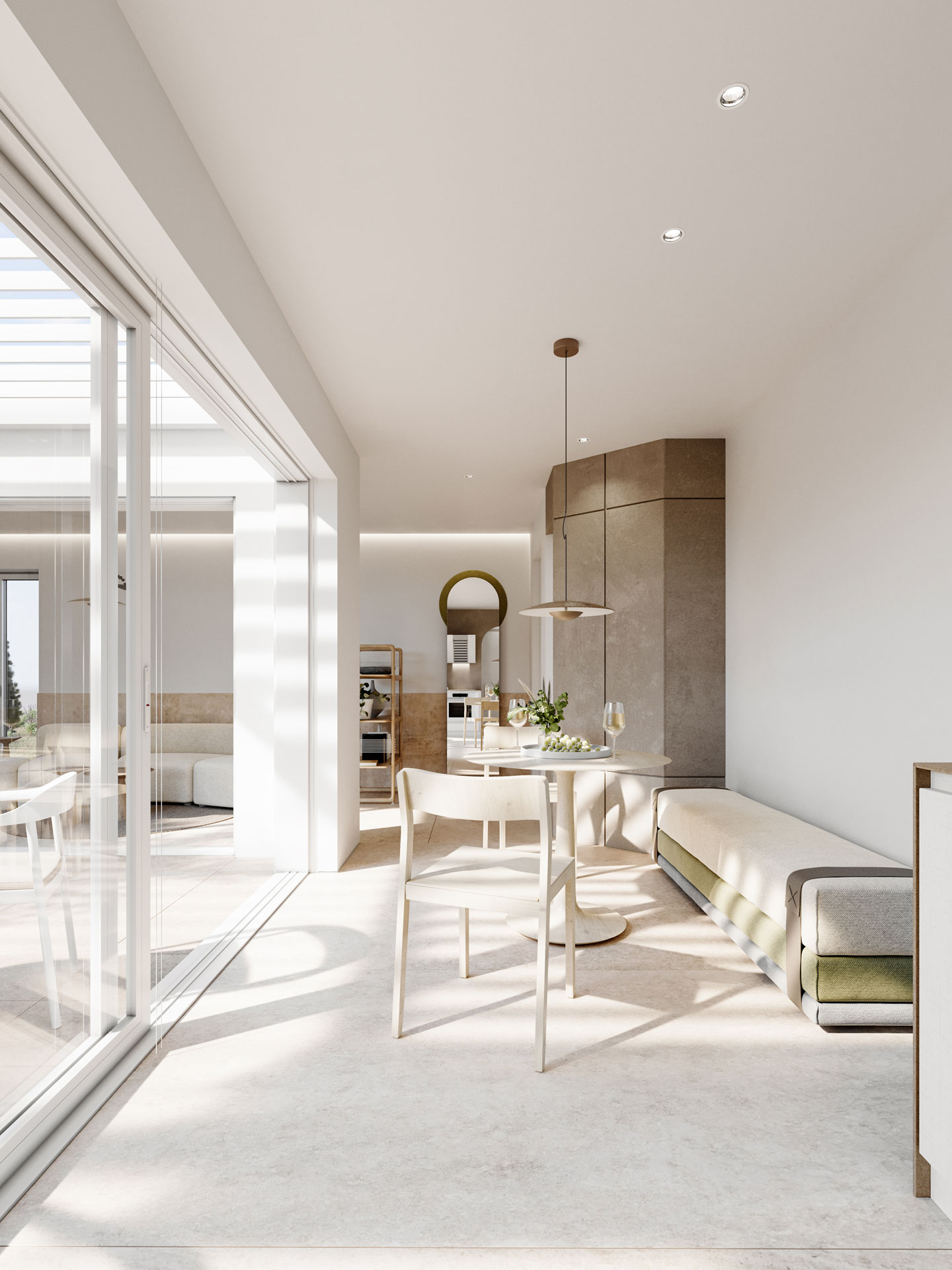Visualization of a contemporary vacation home located on the island of Hvar, Croatia. Positioned on a steep slope with open sea views, the architecture blends minimalistic design with Mediterranean elements, emphasizing natural materials and seamless indoor-outdoor living. The building is characterized by clean geometric volumes, flat roofs, and large glazed openings that frame the surrounding landscape while maintaining a strong connection to the terrain.