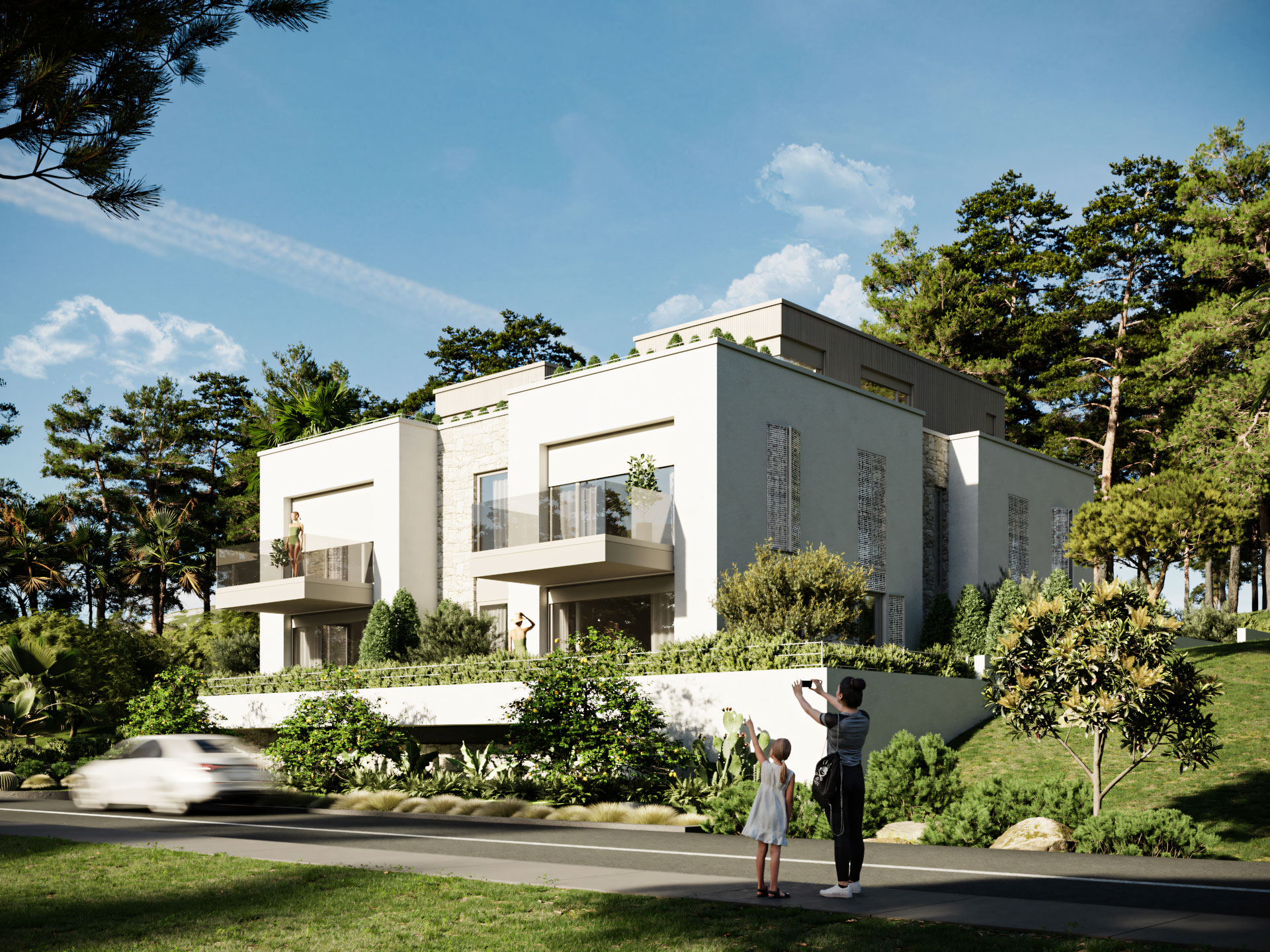 Visualization of a contemporary vacation home located on the island of Hvar, Croatia. Positioned on a steep slope with open sea views, the architecture blends minimalistic design with Mediterranean elements, emphasizing natural materials and seamless indoor-outdoor living. The building is characterized by clean geometric volumes, flat roofs, and large glazed openings that frame the surrounding landscape while maintaining a strong connection to the terrain.