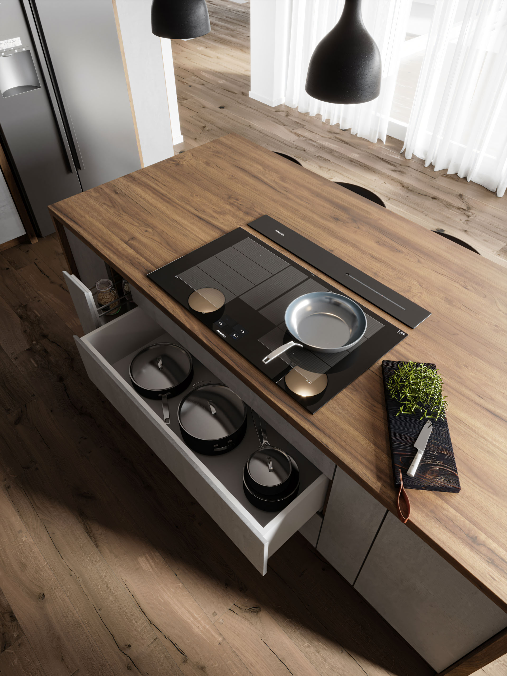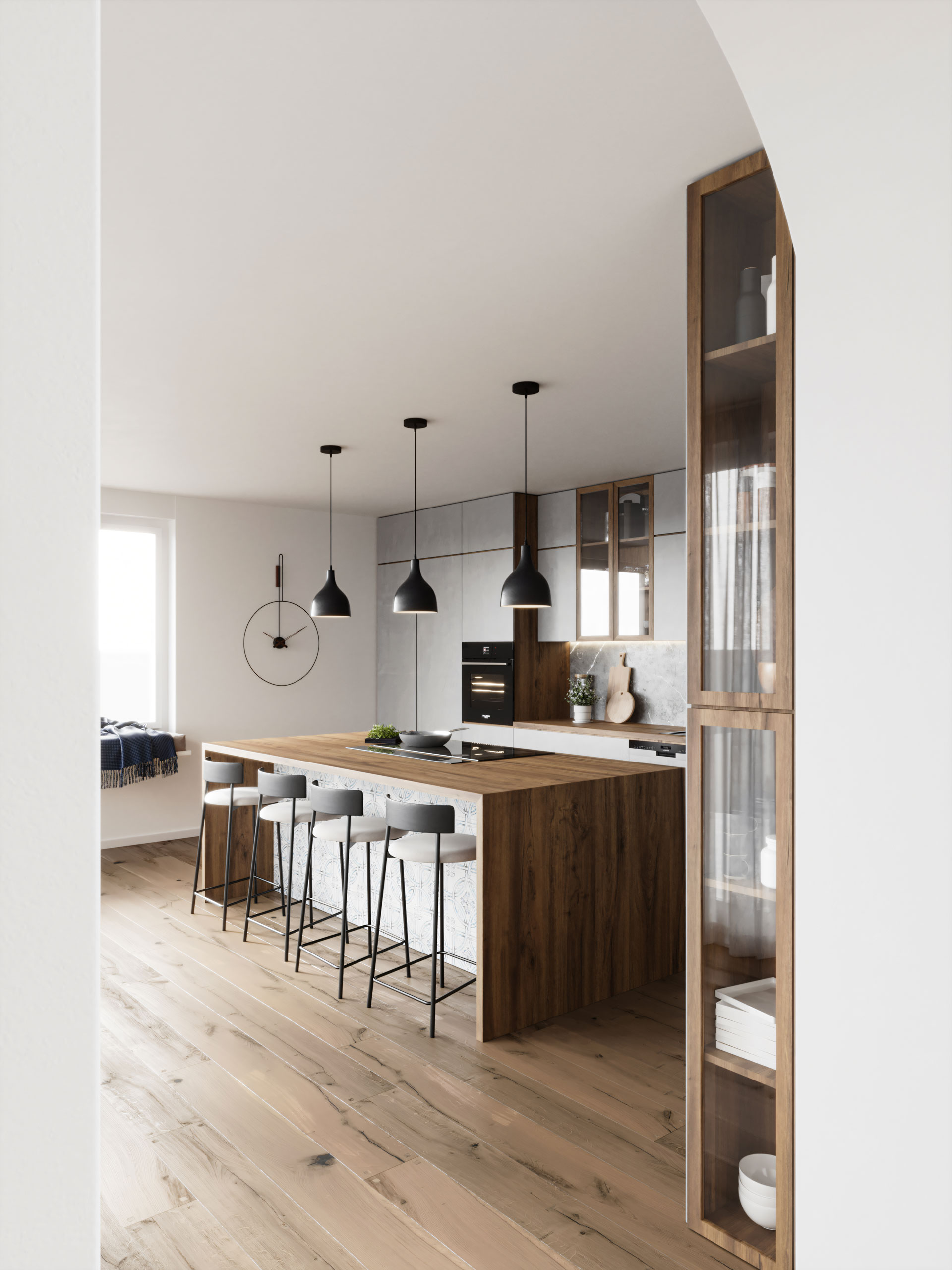 A warm and contemporary kitchen at the heart of a family home combines natural materials like wood and stone with a minimalist design. The central island and open shelving create a functional yet welcoming space for everyday living. The mix of bright tones, warm wood, and black accents adds to an elegant but cozy atmosphere.