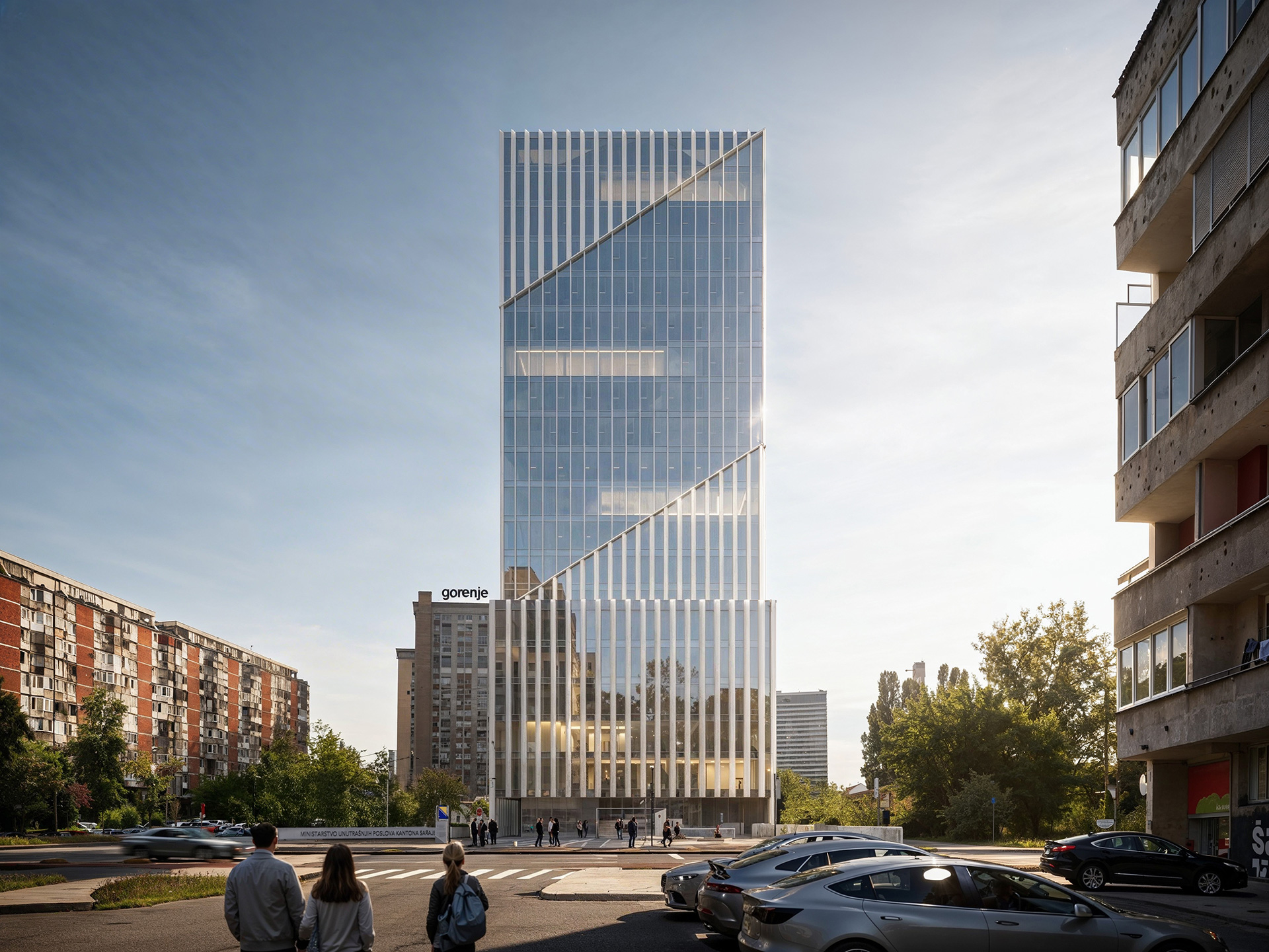 Second place in the competition. Designed as a contemporary landmark, the building is structured into two clear elements — a solid base and a slender tower — establishing a strong vertical presence in the urban landscape. The architectural expression emphasizes clarity and order, reflecting the institutional character of the program. The material palette consists of exposed concrete, metal panels, and glass, creating a contrast between solidity and transparency. Vertical metal fins enhance the tower's elegance and rhythm while also providing functional shading. The diagonal cuts in the façade subtly articulate the volume and reduce its visual mass, giving the structure a distinctive silhouette within the city skylin