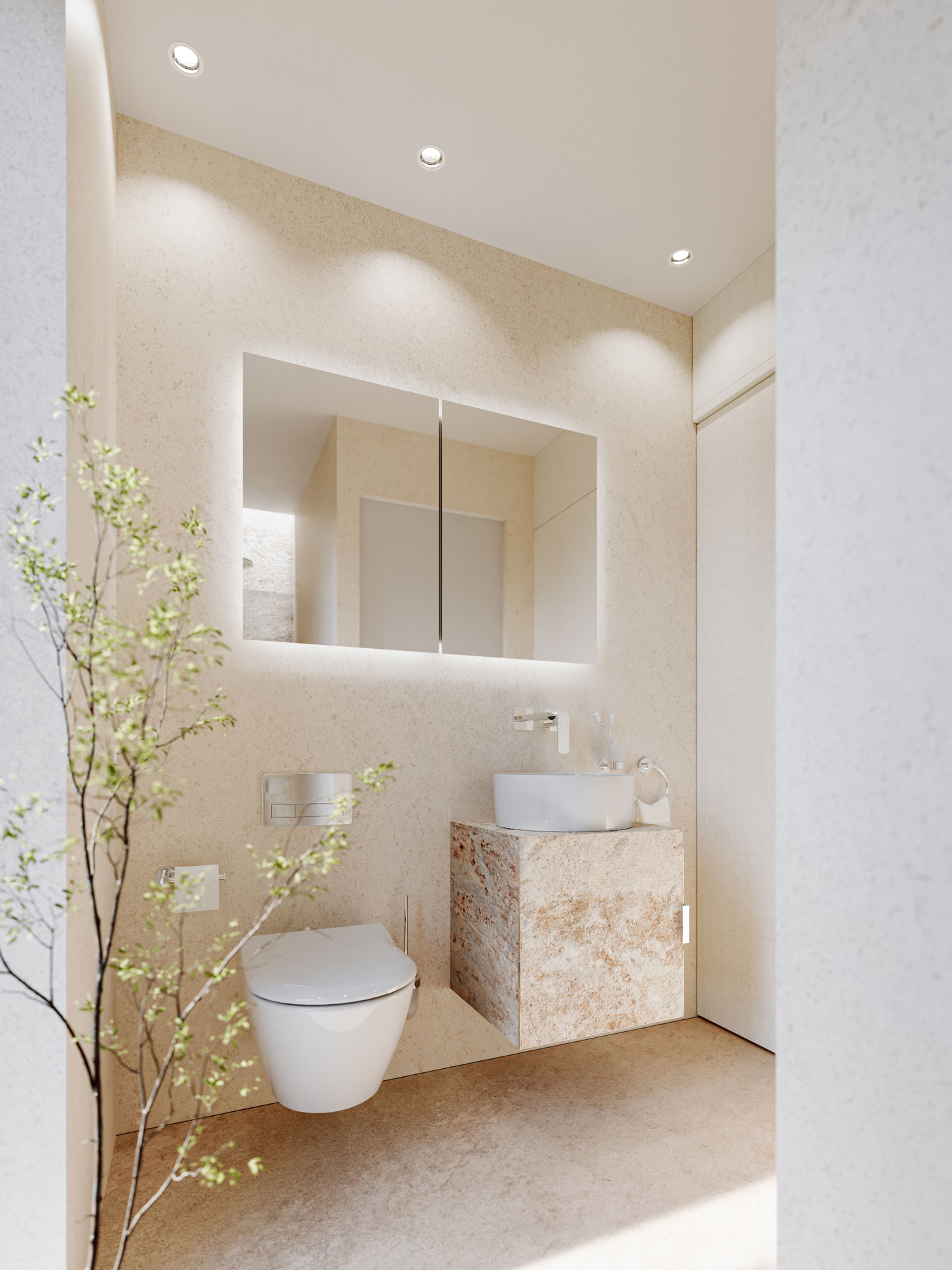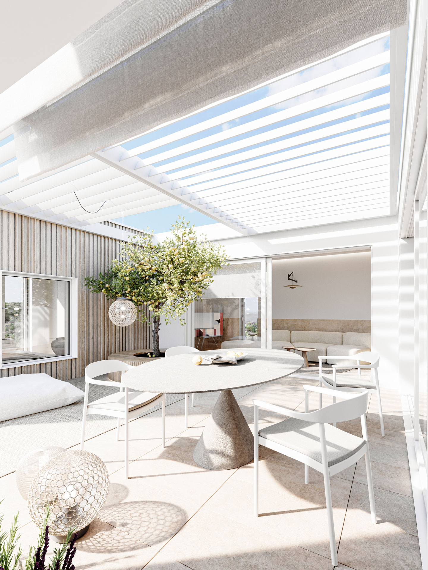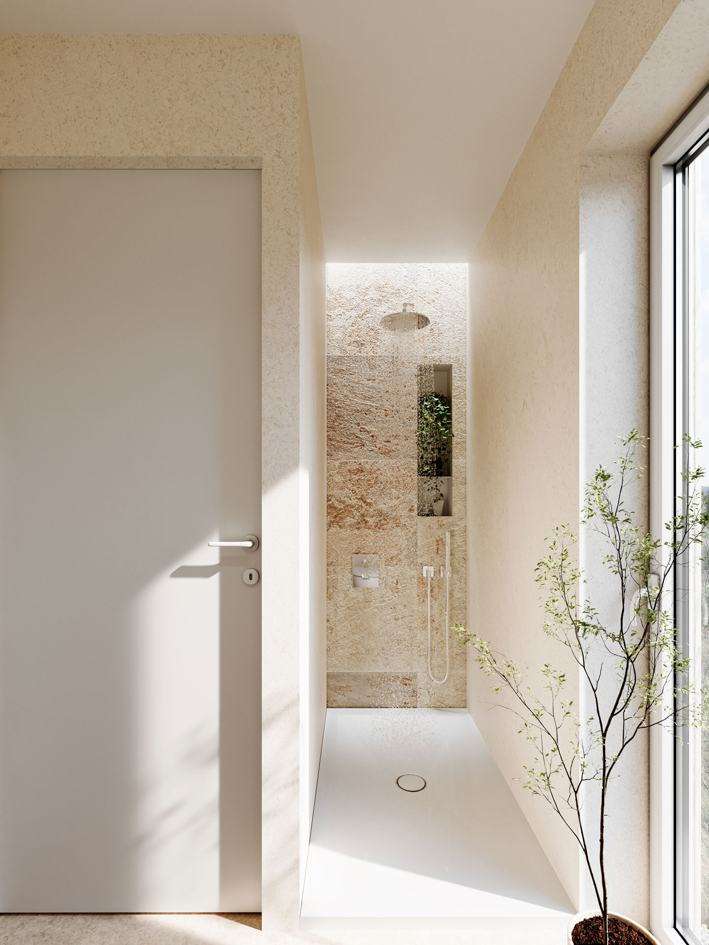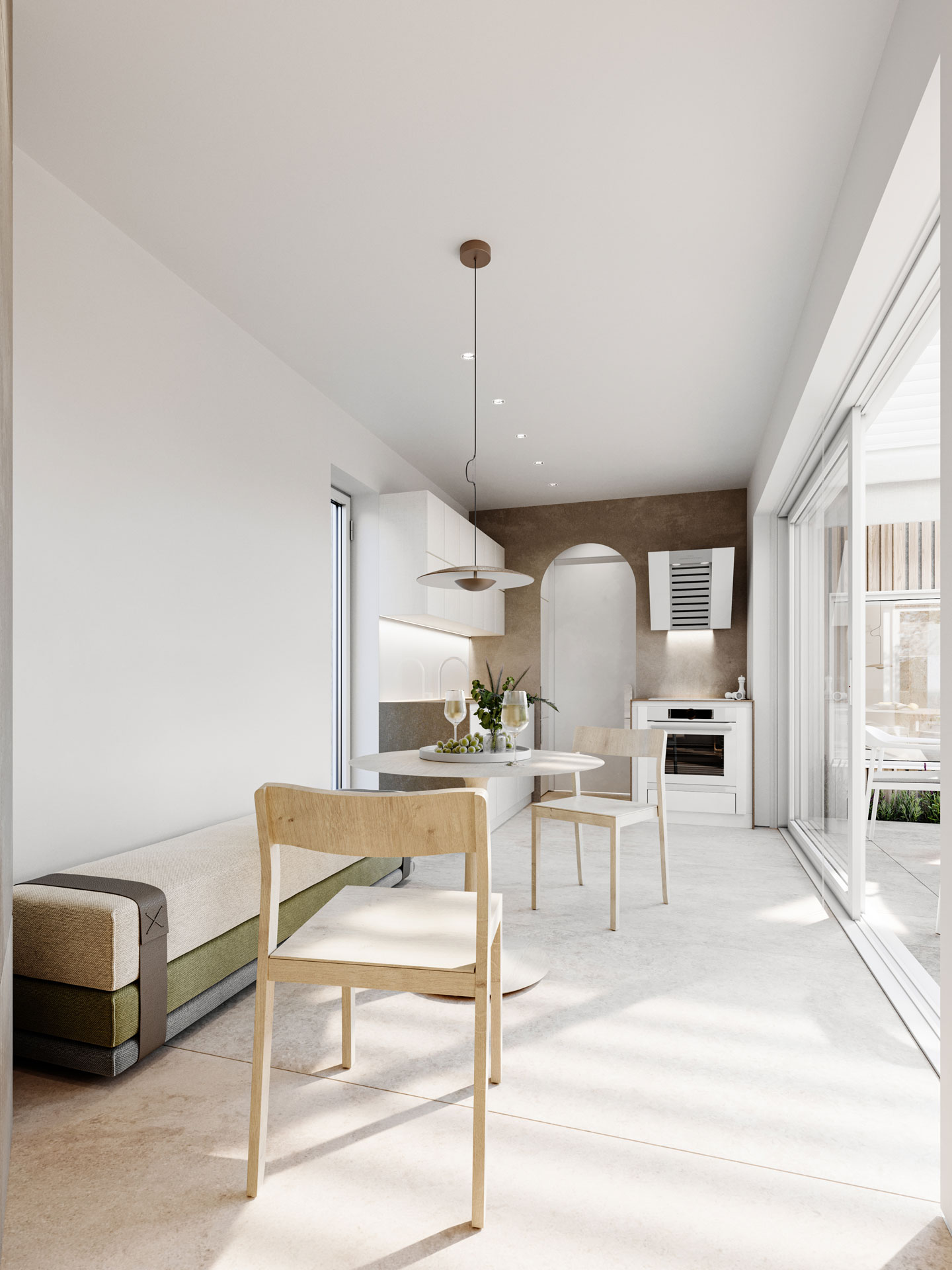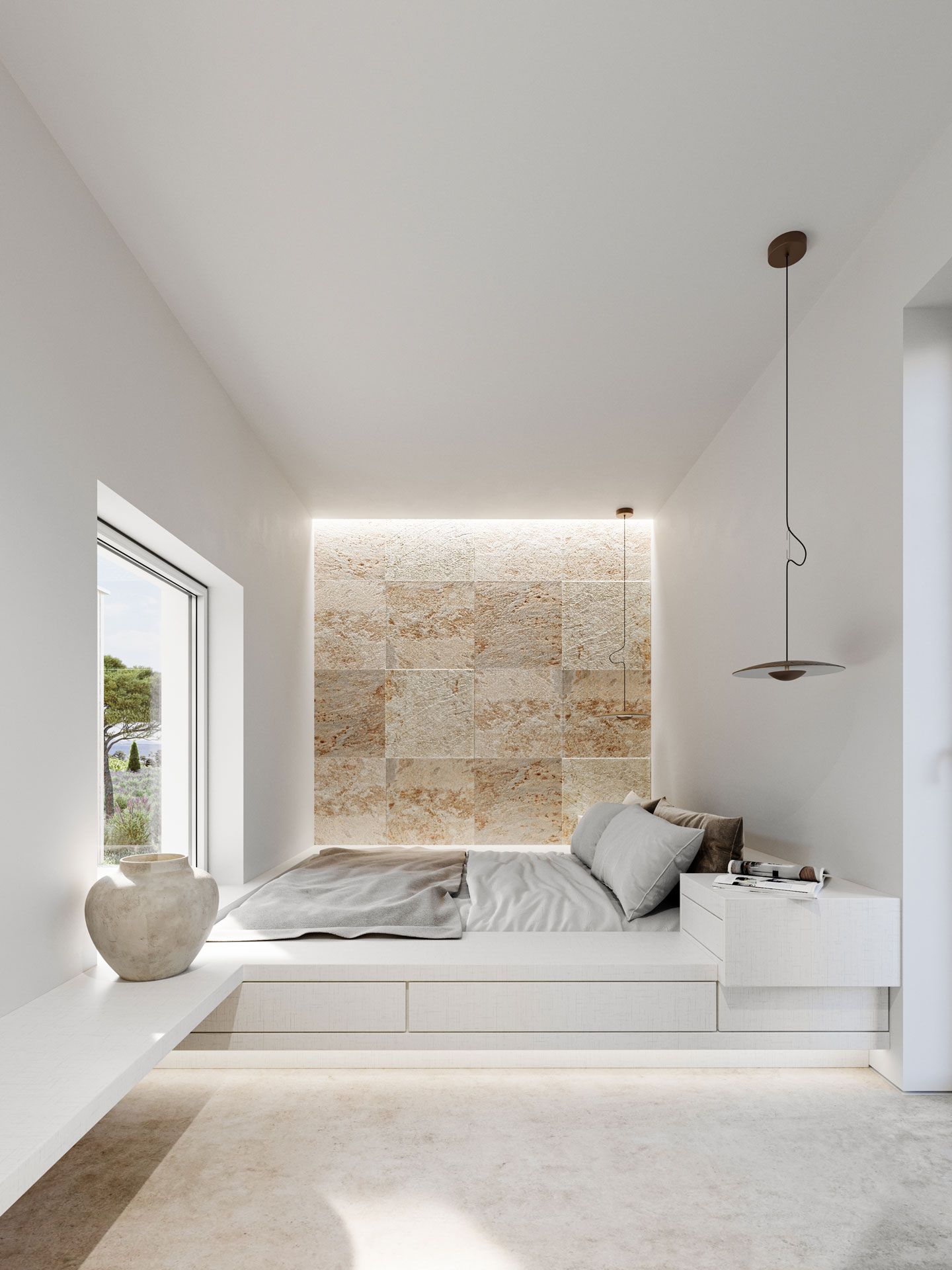 Visualization of a contemporary vacation home located on the island of Hvar, Croatia. Positioned on a steep slope with open sea views, the architecture blends minimalistic design with Mediterranean elements, emphasizing natural materials and seamless indoor-outdoor living. The building is characterized by clean geometric volumes, flat roofs, and large glazed openings that frame the surrounding landscape while maintaining a strong connection to the terrain.