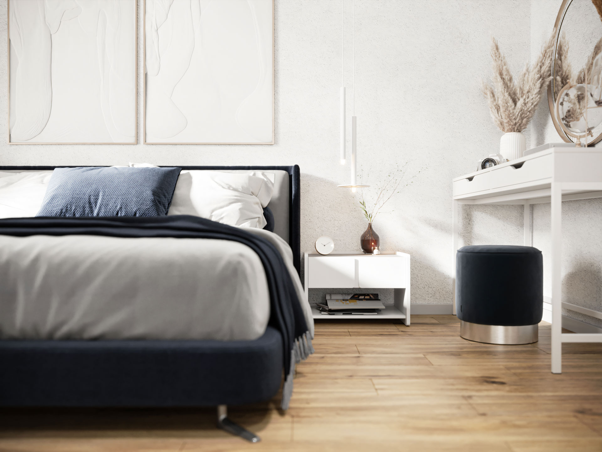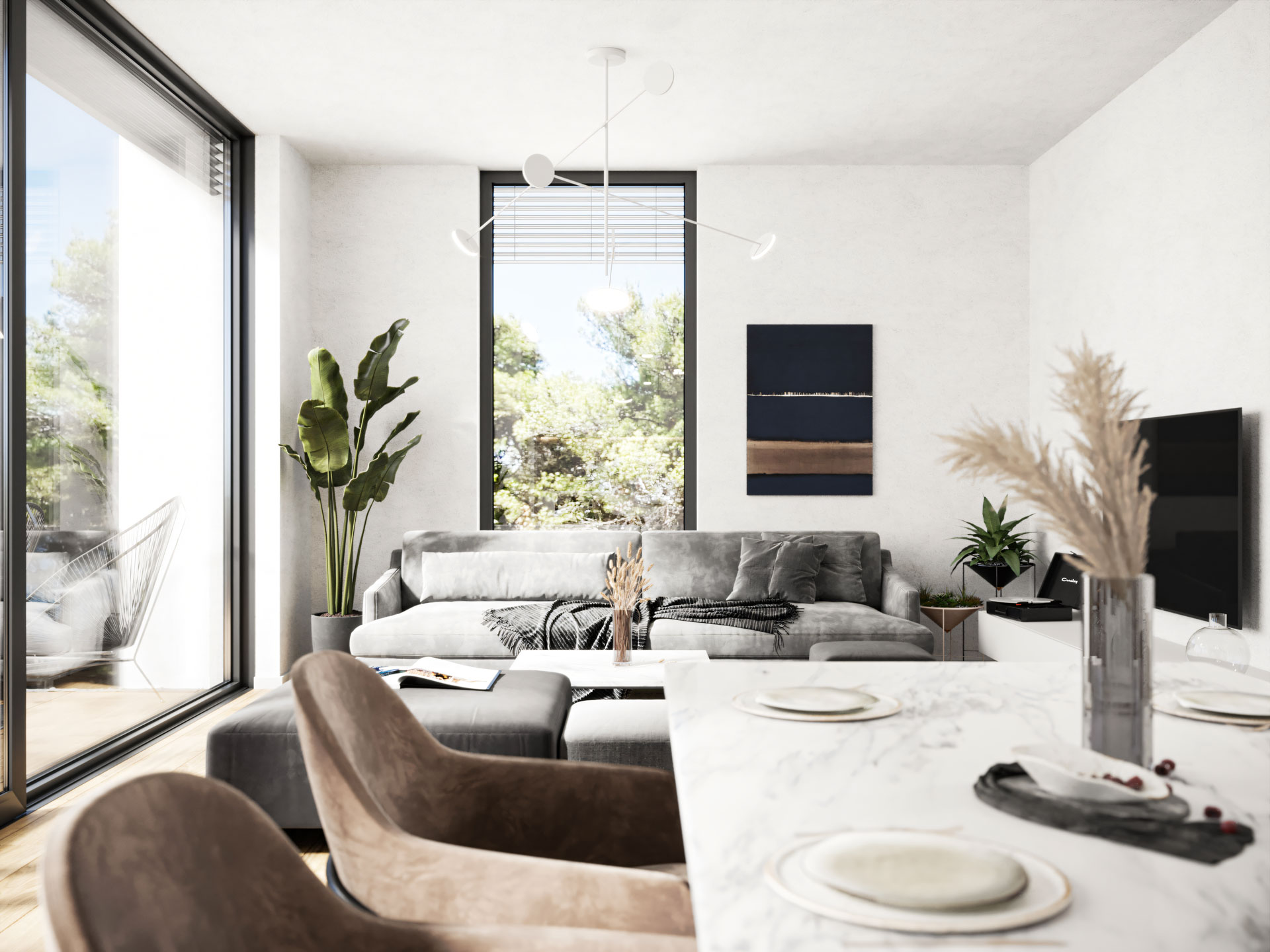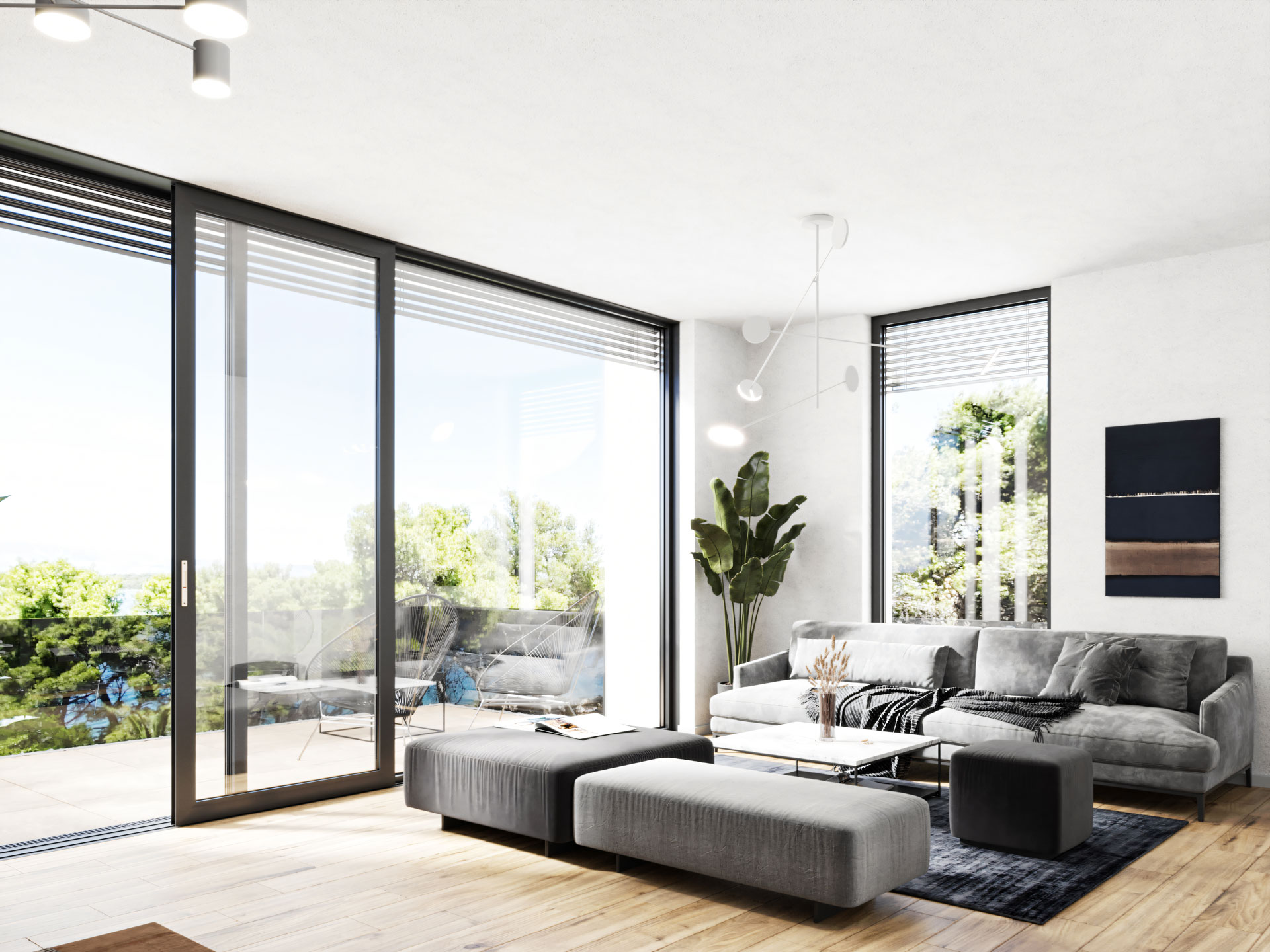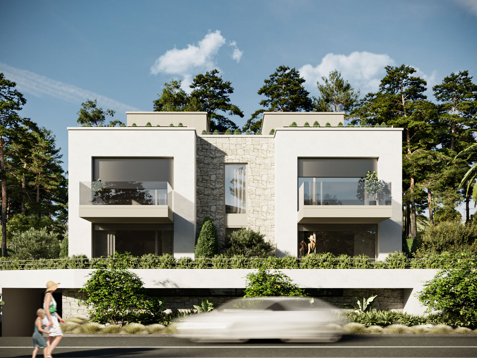 Visualization of a contemporary vacation home located on the island of Hvar, Croatia. Positioned on a steep slope with open sea views, the architecture blends minimalistic design with Mediterranean elements, emphasizing natural materials and seamless indoor-outdoor living. The building is characterized by clean geometric volumes, flat roofs, and large glazed openings that frame the surrounding landscape while maintaining a strong connection to the terrain.