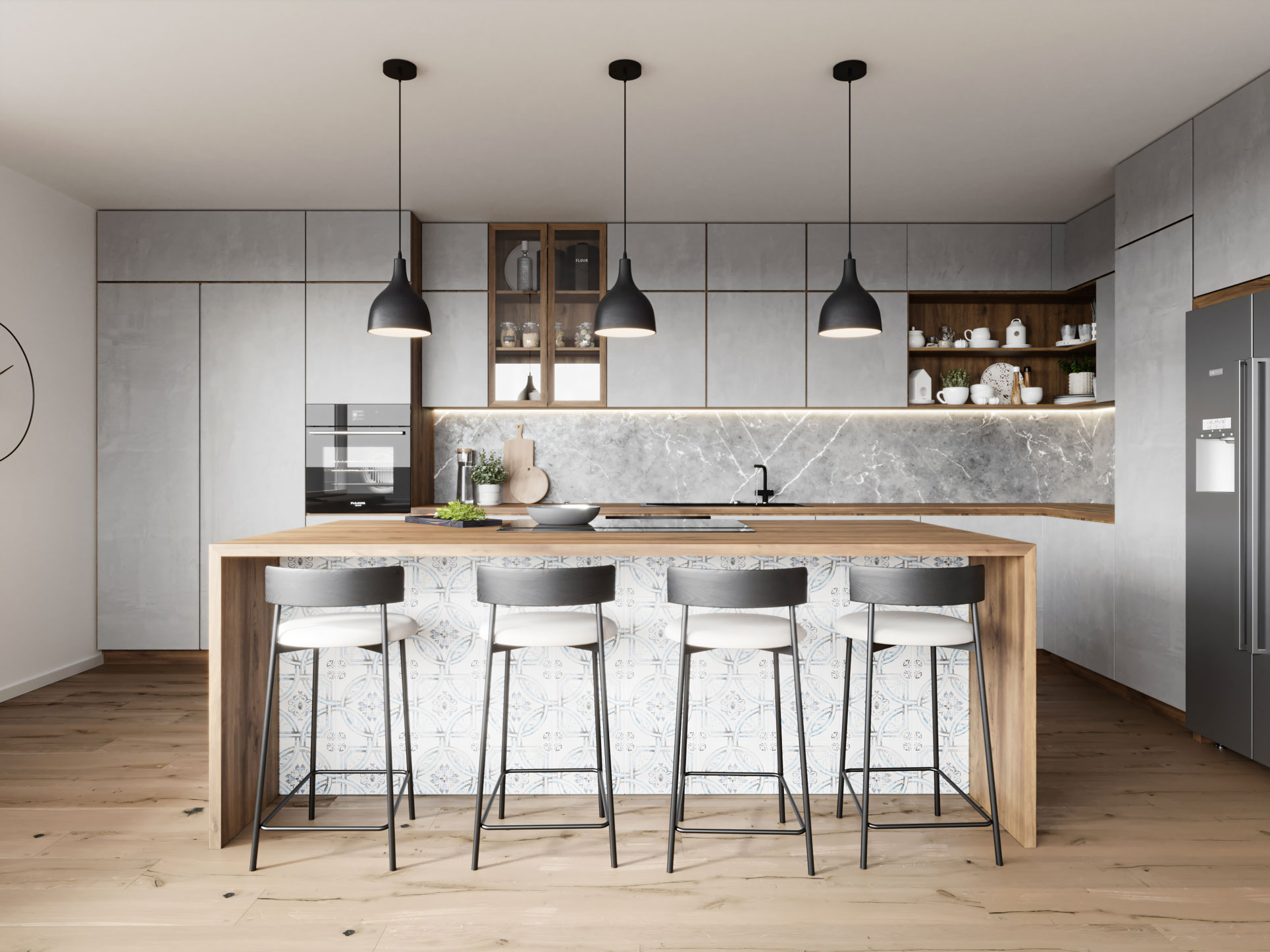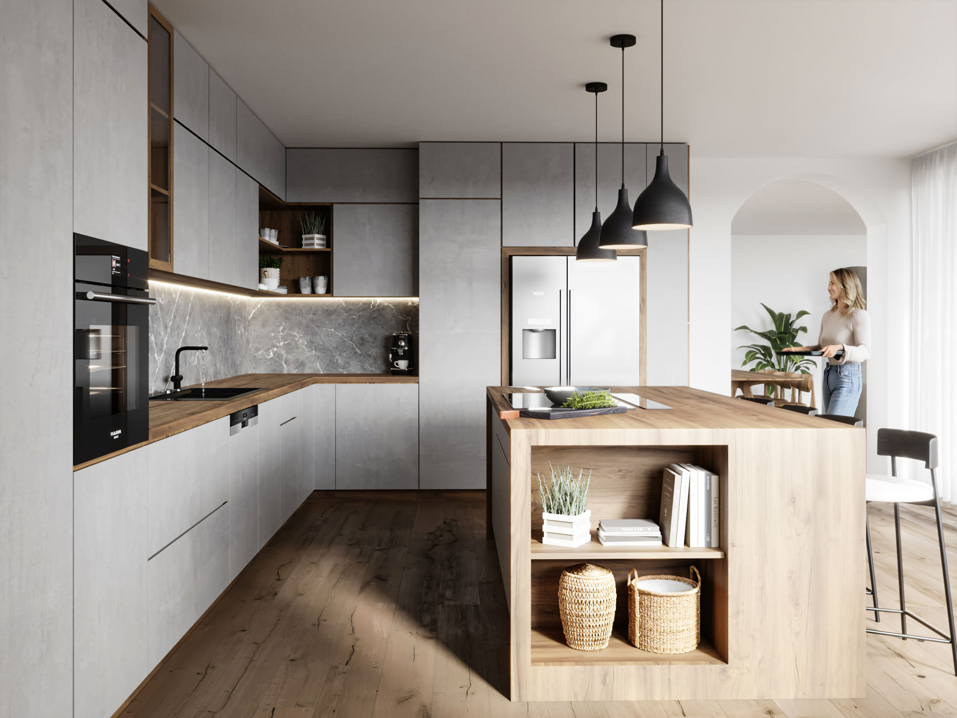 A warm and contemporary kitchen at the heart of a family home combines natural materials like wood and stone with a minimalist design. The central island and open shelving create a functional yet welcoming space for everyday living. The mix of bright tones, warm wood, and black accents adds to an elegant but cozy atmosphere.