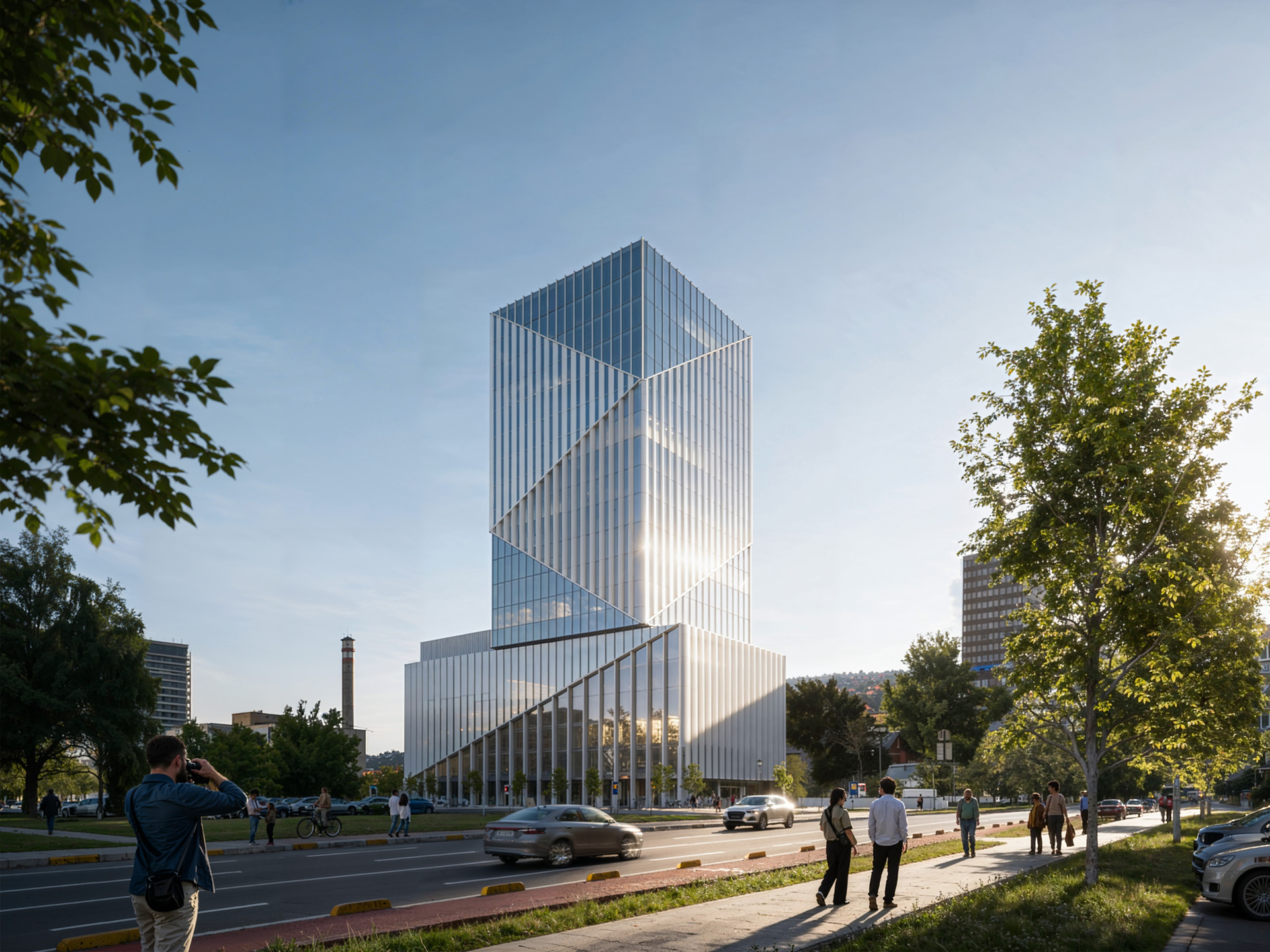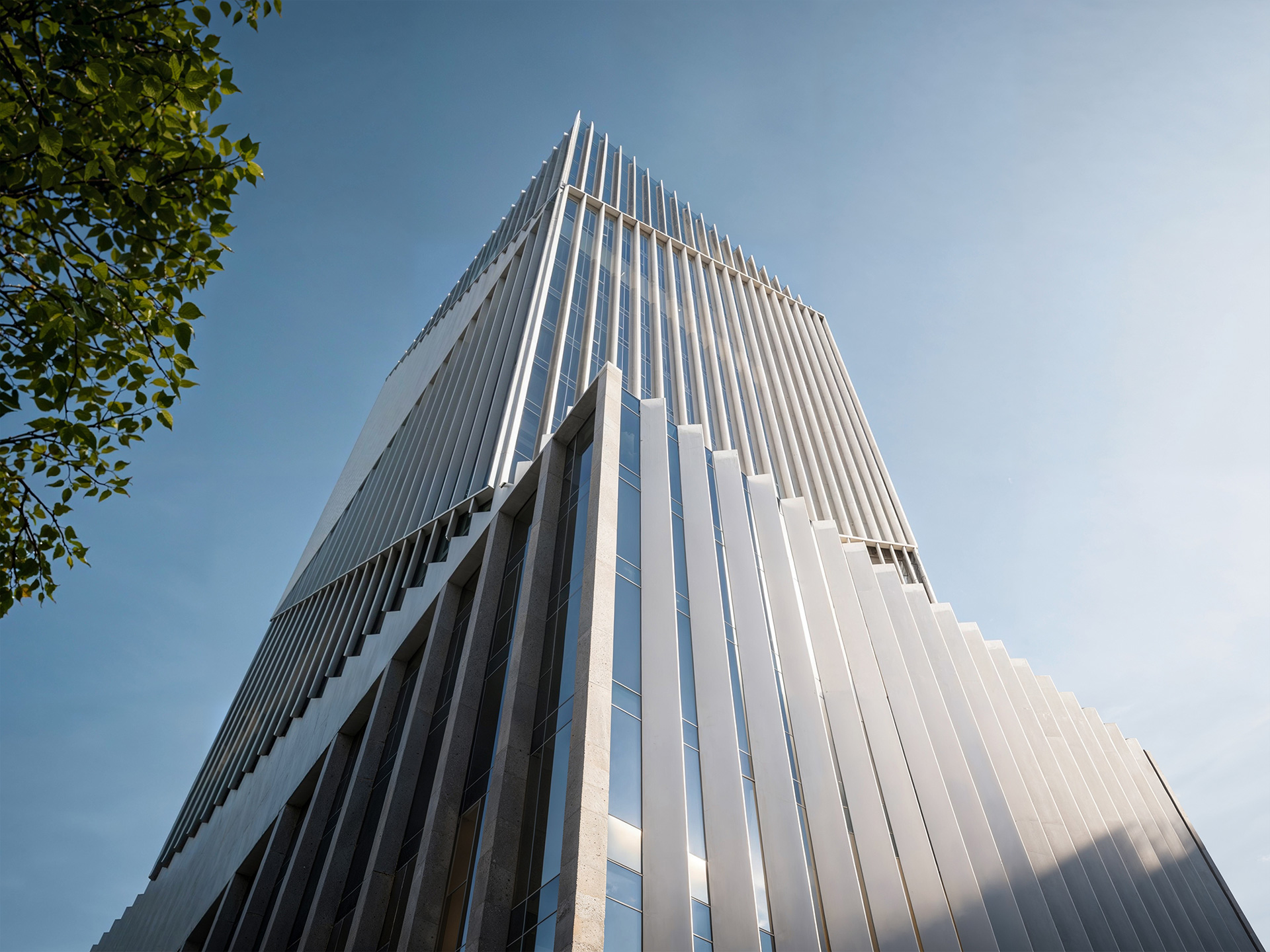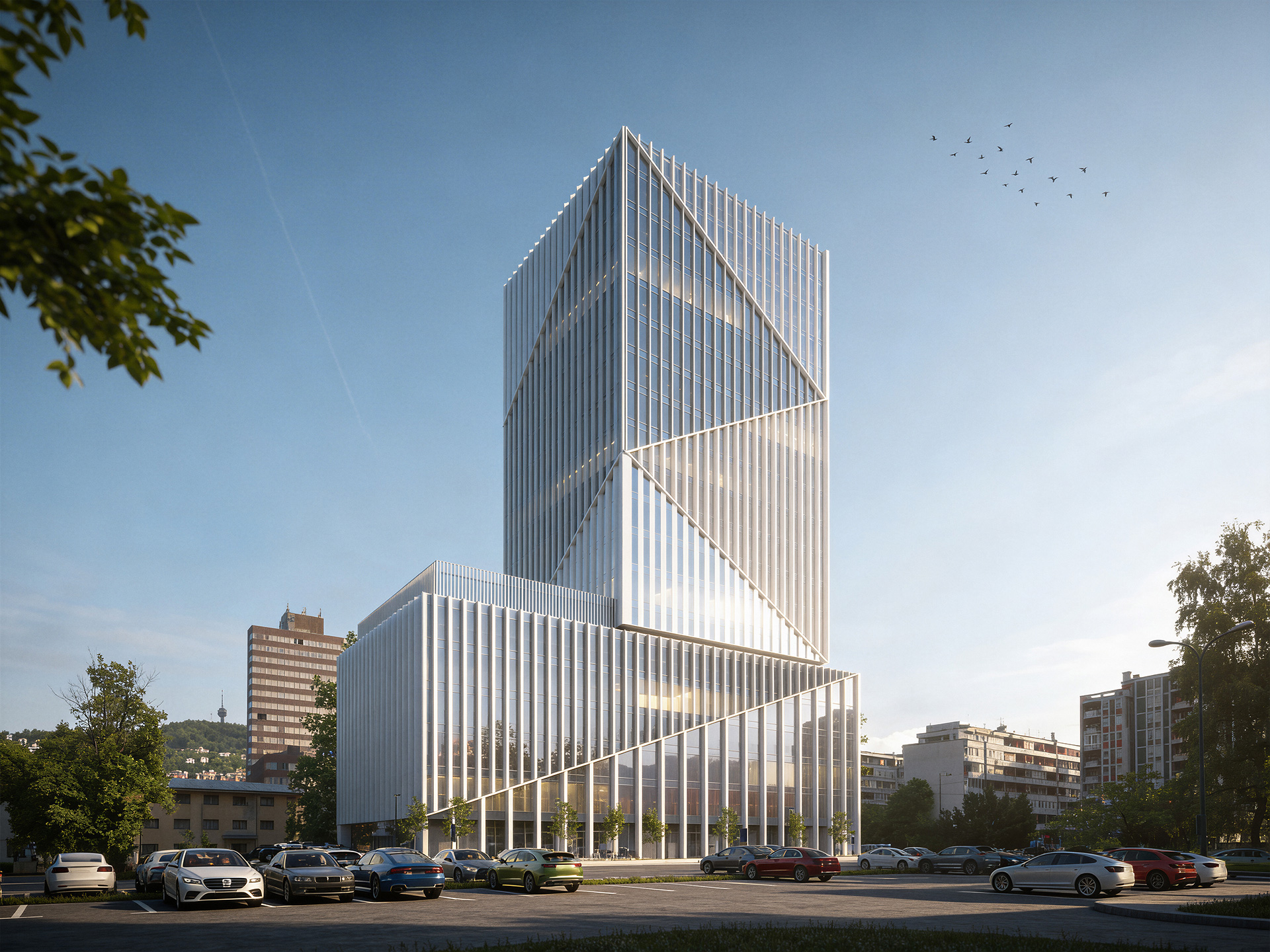 Second place in the competition. Designed as a contemporary landmark, the building is structured into two clear elements — a solid base and a slender tower — establishing a strong vertical presence in the urban landscape. The architectural expression emphasizes clarity and order, reflecting the institutional character of the program. The material palette consists of exposed concrete, metal panels, and glass, creating a contrast between solidity and transparency. Vertical metal fins enhance the tower's elegance and rhythm while also providing functional shading. The diagonal cuts in the façade subtly articulate the volume and reduce its visual mass, giving the structure a distinctive silhouette within the city skylin